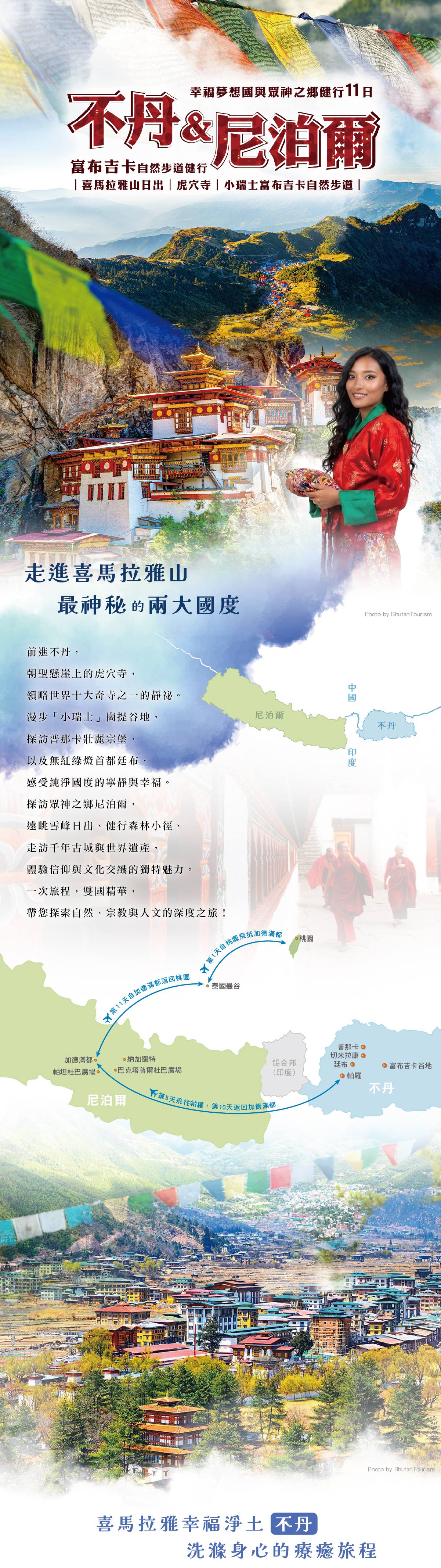 2026/11/16(一) | 桃園國際機場出發 【不丹+尼泊爾】探索幸福夢想國度不丹․虎穴寺․小瑞士〜富布吉卡自然步道健行․眾神之鄉神秘古國尼泊爾․喜馬拉雅山日出11日機位 17 候補0 已售0 可售16 |