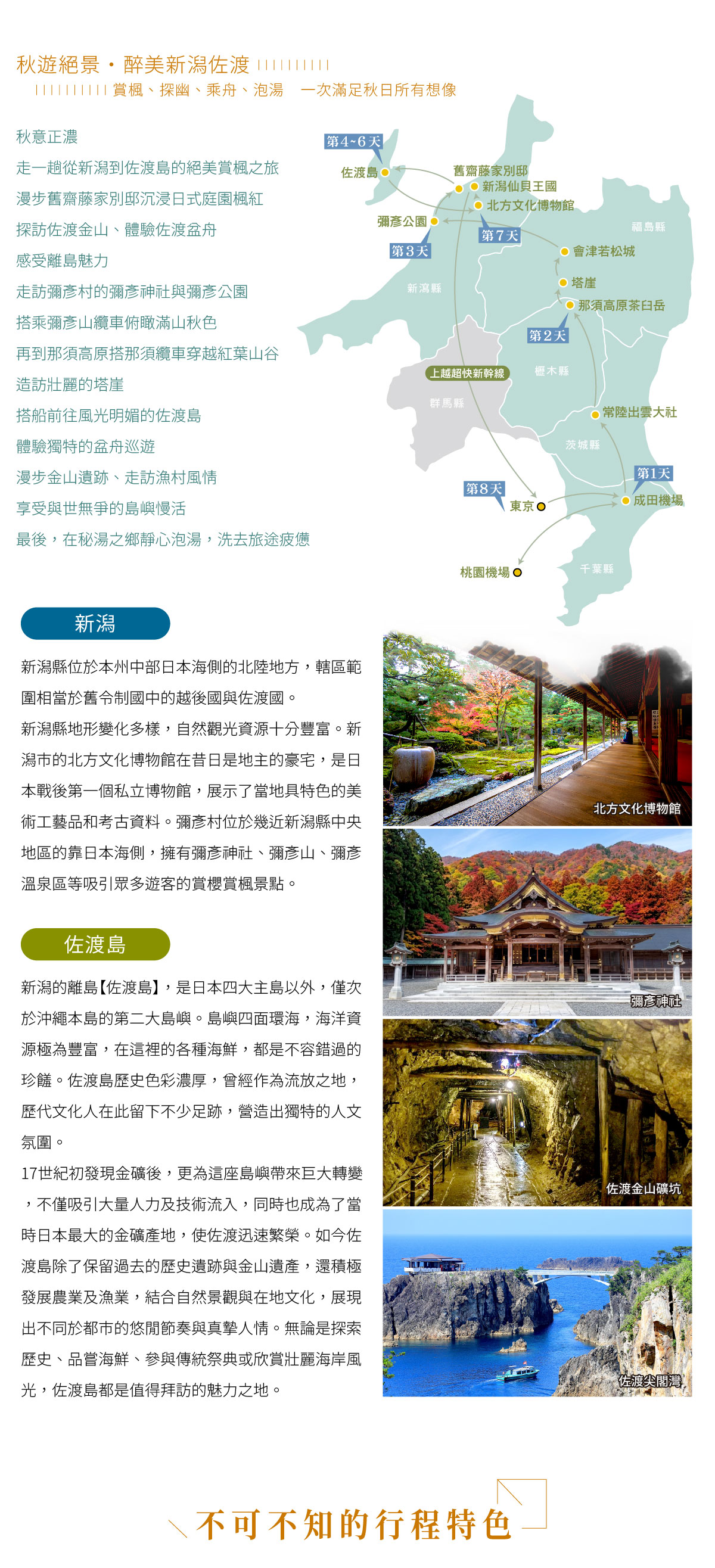 【備註】團費已含每人門票費用:船票(新潟ー兩津)¥4500,佐渡金山¥1500