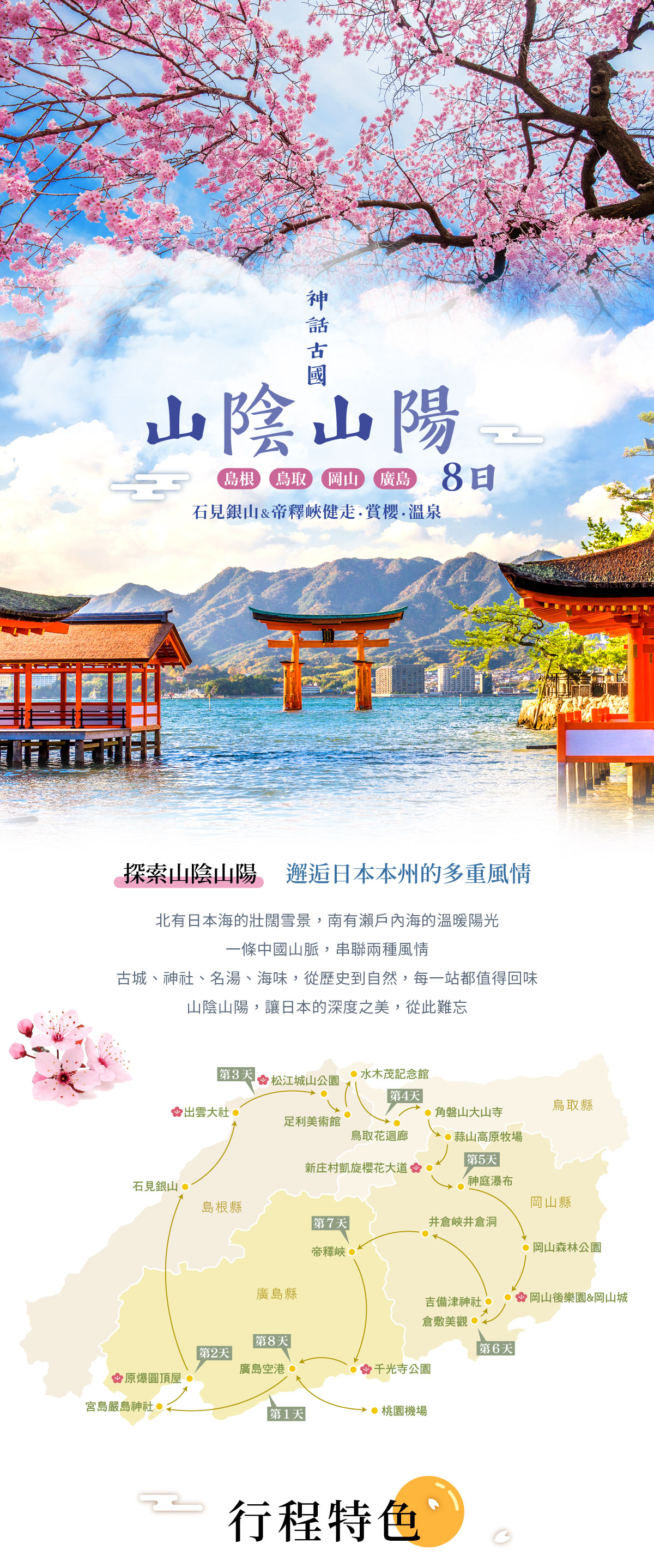 【山陰山陽神話古國】島根、鳥取、岡山、廣島~石見銀山&帝釋峽健走‧鬼太郎街道‧賞櫻花見溫泉8日 |