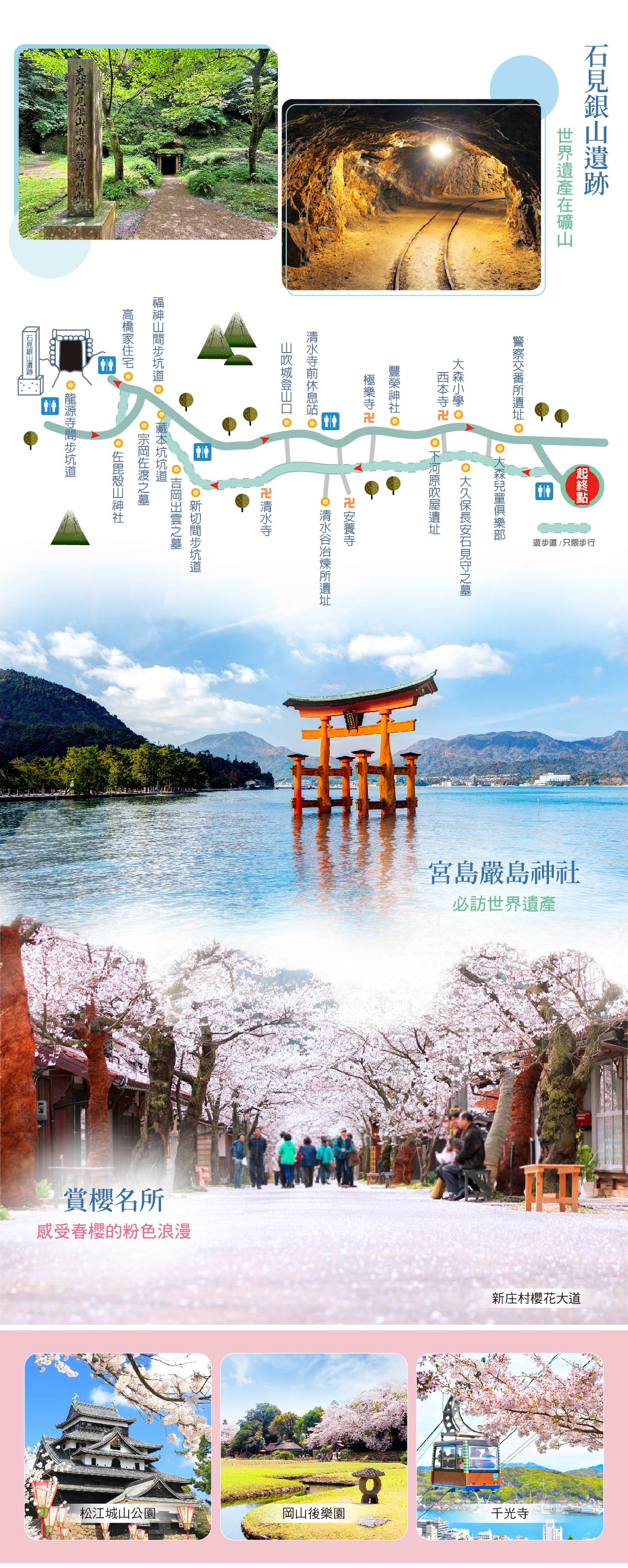 ◆ 安排 山陰山陽賞櫻名所 一次看個夠:廣島和平紀念公園、出雲大社、松江城山公園、新庄村、岡山後樂園、千光寺。
