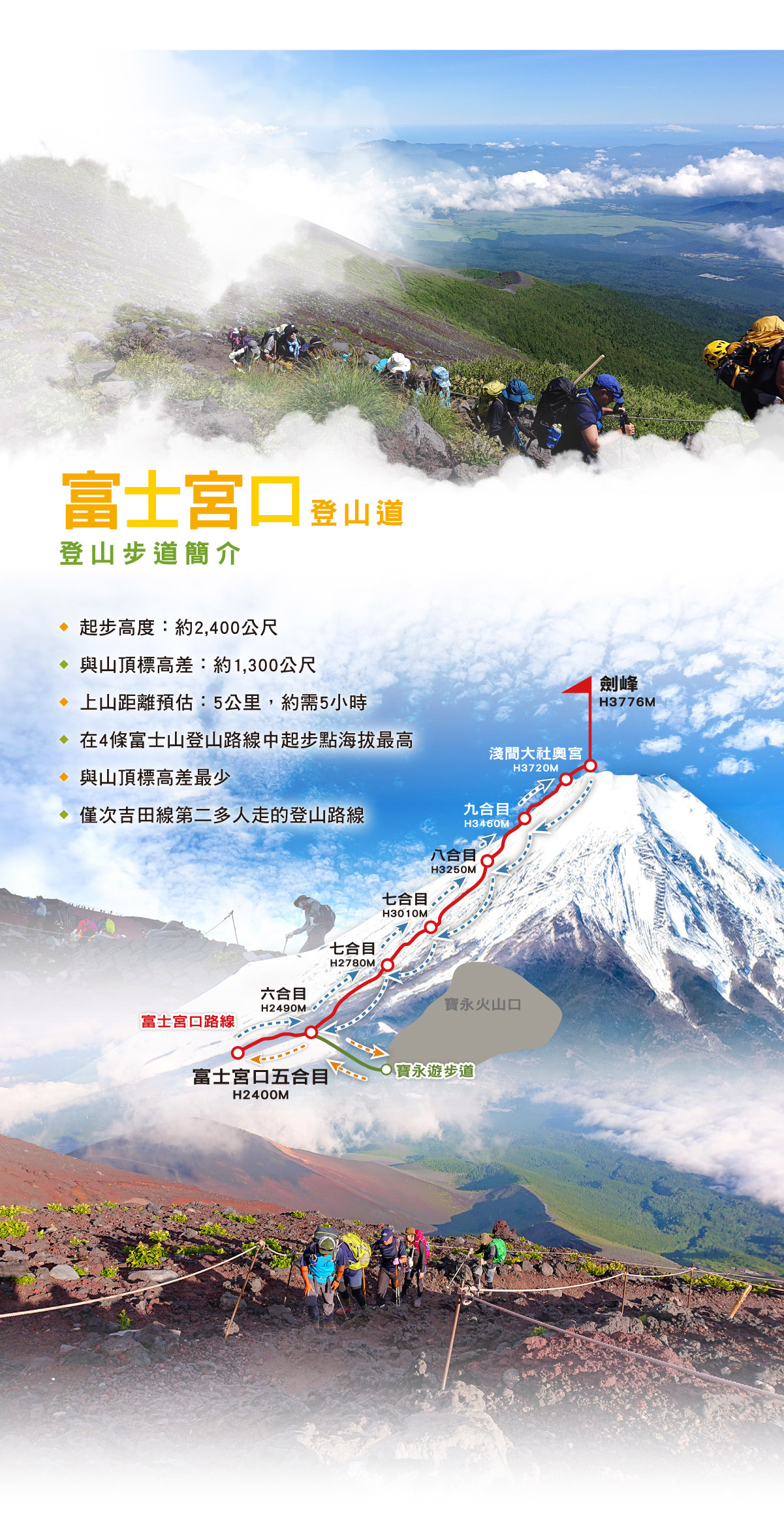 安排富士宮口登山道進行登頂,回程還能展望及走進巨大的寶永火山口,是僅次吉田線第二多人走的登山路線。