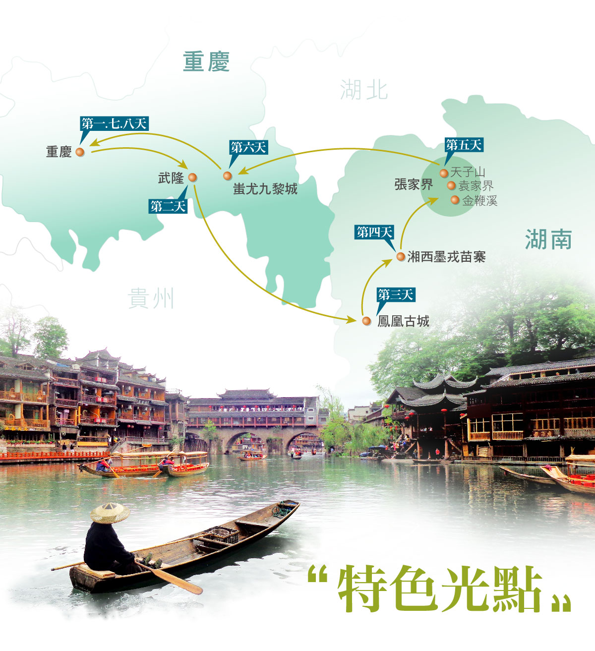 1.行程包含重慶武隆至張家界的獨家設計路線,內容豐富多元,一次集結自然奇景、山城風貌與世界級景觀,讓旅程更加精彩充實。
