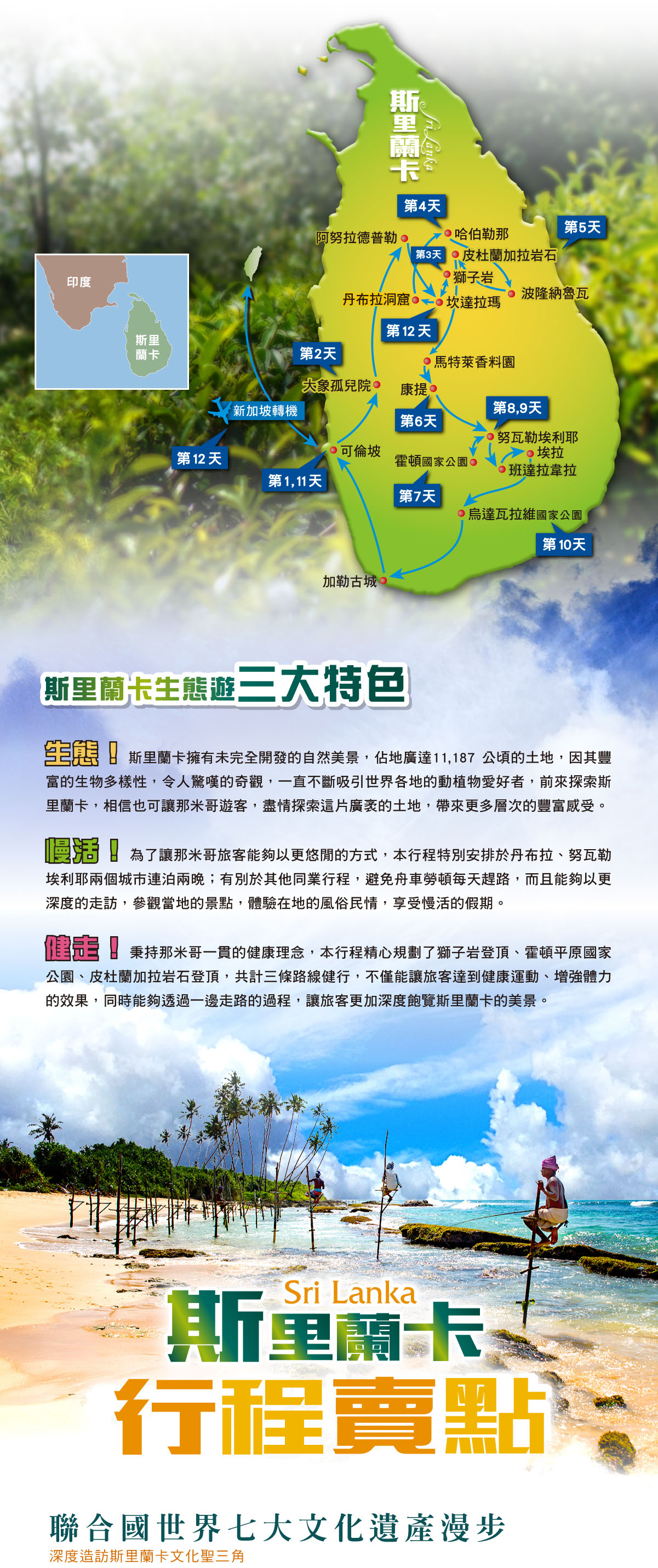 斯里蘭卡位於印度東南方,是一個形狀像似菩提葉般的島國,古代稱「獅子國」或「錫蘭」,其詞意為光明富庶的樂土,自古以來就是東西方銜接的海上樞紐,印度人、歐洲人、阿拉伯人、中國人都在這裡留下了足跡,素有「印度洋上的珍珠」、「寶石王國」、「紅茶之國」等美稱,也曾被馬可波羅認定是最美的島嶼。國土面積65,610 平方公里,約台灣2倍大,擁有豐富的世界遺產、蔚藍的海岸線、宗教的神祕、豐饒的大自然生態、純樸的人民,吸引您來此一探究竟。本行程將特別規劃「阿努拉德普勒聖城(1982年列入世界遺產)、波隆納魯瓦古城(1982年列入世界遺產)、天空之城〜斯基里亞獅子岩(1982年列入世界遺產)、康提佛牙寺(1991年列入世界遺產)、黃金寺院丹布拉石窟(1988年列入世界遺產)、加勒古城及其堡壘(1988年列入世界遺產)、霍頓平原國家公園(2010年列入世界遺產)」,共計世界七大遺產漫步,帶您深度走訪斯里蘭卡的傳奇與偉大!而行程也將帶您深度造訪「斯里蘭卡文化三角(Sri Lankan Cultural Triangle)」,這是由中部古城康提、東部古城波隆納魯瓦和西部古城阿努拉德普勒,由這三個古都所形成的三角地帶,絕對讓您擁有一趟難忘的旅程。