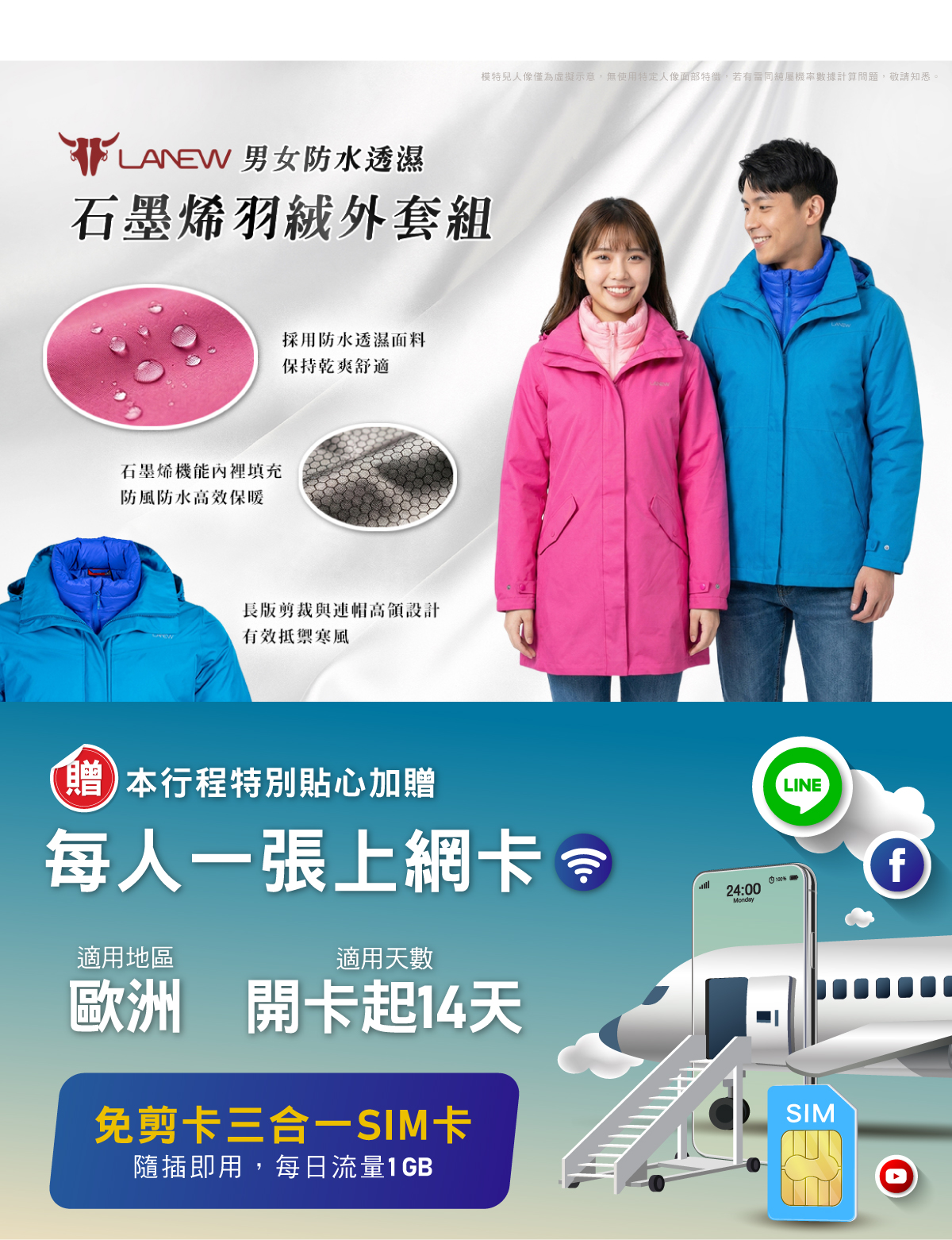 ◎好禮1.【獨家贈送】LA NEW男、女防水透濕石墨烯羽絨外套組一組(市價NT$24,600元)