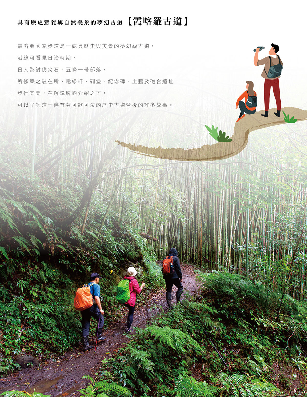 走入霞喀羅古道,就像閱讀一篇泰雅史詩,詠嘆著百餘年來族人在薩克亞金溪流域的生命歷史與生活點滴;也因為她沿途坡度不大、景緻優美,適合登山健行,體驗森林生態與部落文化,因而被林務局選為建置國家步道系統之首。