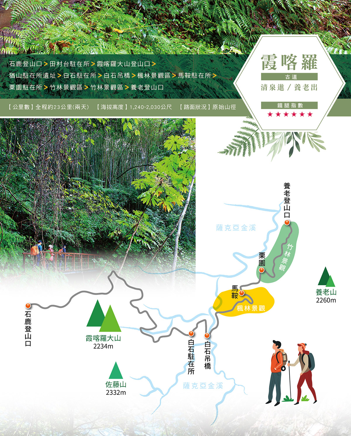 【路線】石鹿登山口-田村台駐在所-霞喀羅大山登山口-猶山駐在所遺址-白石駐在所-白石吊橋-楓林景觀區-馬鞍駐在所-粟園駐在所-竹林景觀區-養老登山口 【方向】A進B出,石鹿登山口進,養老登山口出,不折返 【公里數】全程約23公里(兩天) 【海拔高度】1,240~2,030公尺 【路面狀況】原始山徑 【等級】6星級