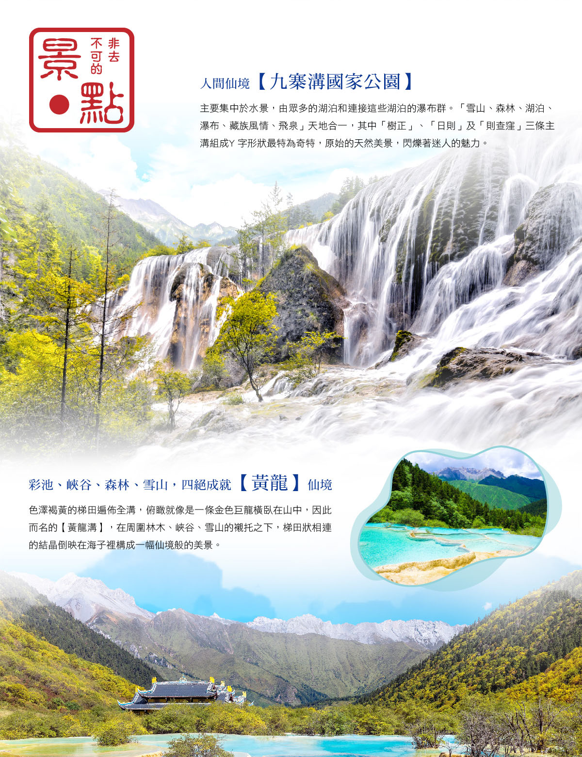 ◎參觀世界上規模最宏大,結構最完整造型最奇特的喀斯特地貌景觀【黃龍風景區】。